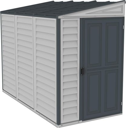 Duramax SideMate PLUS 4 x 8 (2.91 m²) abri de jardin en plastique avec kit de fondation en métal, porte réversible, structure de toit en métal robuste, abri en vinyle sans entretien, Gris foncé/ Adobe